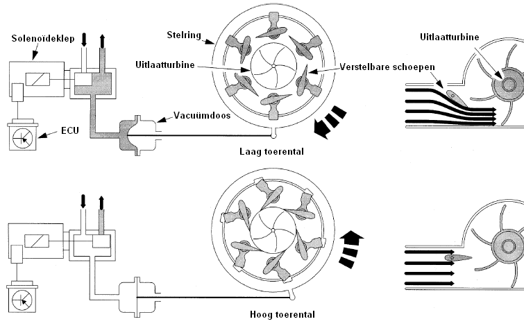 A turbo with a wastegate can suffer from turbo lag. Only when the engine reaches a certain rpm is there enough exhaust-gas energy available to spool the turbo up quickly. At low rpm, exhaust-gas pressure is often too low to drive the turbo effectively. A variable-geometry turbo has no wastegate, but is equipped with adjustable vanes in the turbine housing. These vanes can change position by means of an adjusting ring. The adjusting ring is usually rotated using vacuum. The required amount of vacuum is determined by the ECU based on engine load and engine speed and controlled via a solenoid valve.