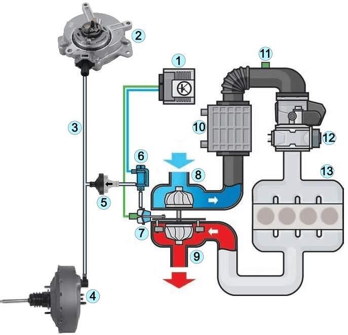 The image below shows boost pressure control with wastegate adjustment. The vacuum pump (2) supplies vacuum to both the brake booster (4) and the wastegate actuator on the turbo (7). The check valve (5) ensures that the airflow can only go one way: vacuum can be drawn from the wastegate, but if the vacuum on the brake booster side partially drops out, for example after repeated (pumping) braking and the vacuum pump has not yet generated sufficient vacuum, it has no influence on boost pressure control. The explanation of the boost pressure control continues below the image.