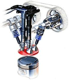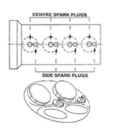 Twin spark is the name Alfa Romeo uses for their engines, which are equipped with 2 spark plugs per cylinder. In a twin spark engine, there are two different types of spark plugs per cylinder; namely, the center spark plugs (central spark plugs) and the side spark plugs (side spark plugs). This is shown in the images below. Due to this technology, fuel injection can also occur differently (combustion is not limited to directly under the spark plug), resulting in combustion over a larger surface area.
