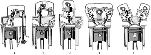 - E: Direct valve operation with hydraulic lifters and multiple valves per cylinder.