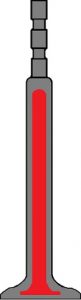 Exhaust valves are hollow inside. The hollow space is filled with approximately 60% sodium. Sodium is a metal that becomes liquid at high temperatures (from around 100 degrees Celsius). In a running engine, the valve frequently moves up and down. The sodium in the valve is constantly sloshed back and forth, transporting the heat. The sodium absorbs heat from the valve head and transfers it to the valve stem. Sodium-filled valves can achieve a temperature drop of 80 to 100 degrees compared to non-sodium-filled valves.