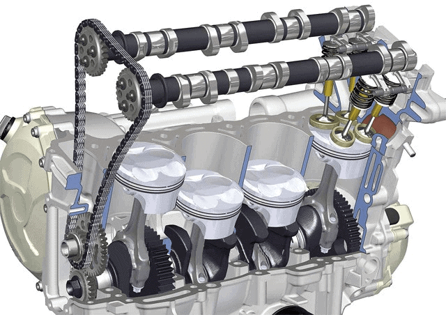 Nowadays, the overhead camshaft is used exclusively in passenger car engines. The camshaft is then placed in the cylinder head. The advantage of engines with an overhead camshaft is that they can run at higher revs than engines with an underhead camshaft.