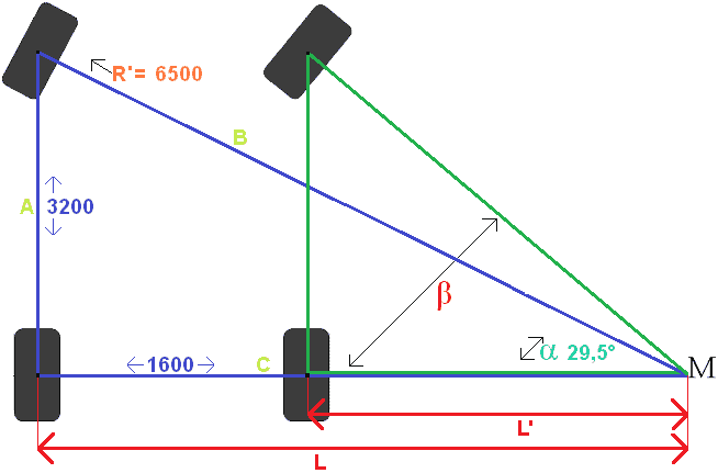 The steered angle of a vehicle can be calculated using several parameters of the car. Below is an image where angle b1 has been calculated. Calculating angle b2 is the next step.