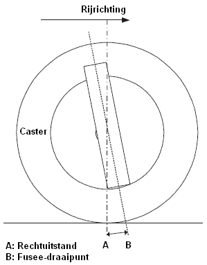 Caster, also known as steering axis inclination or trail, is the angle between the centerline through the steering pivot point B and a line perpendicular to the road through the axle center A. Caster is always positive.