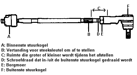Toe refers to the direction of both the front and rear wheels. It is adjustable by lengthening or shortening the tie rods on both sides. Space C in the image then becomes larger or smaller. Tie rod end F moves inwards or outwards, changing the wheel position.