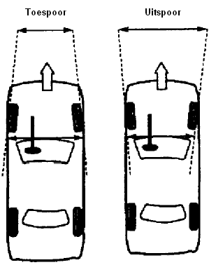 Rear-wheel-drive cars are adjusted to toe-in on the front axle. While driving, the wheels are pulled outward, aligning them straight. Front-wheel-drive cars are usually adjusted to toe-out. While driving, the wheels are drawn inward, aligning them straight. The tolerance is only a few degrees. The diagrams show it “exaggerated,” but in reality, it is not easily visible. Special alignment equipment is needed to observe this.