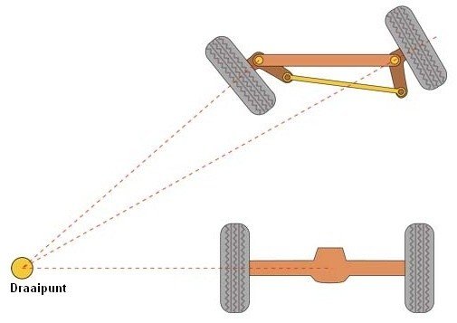 When driving straight, all wheels are aligned straight. The extensions of the centerlines of the steering arms intersect at the midpoint of the rear axle.