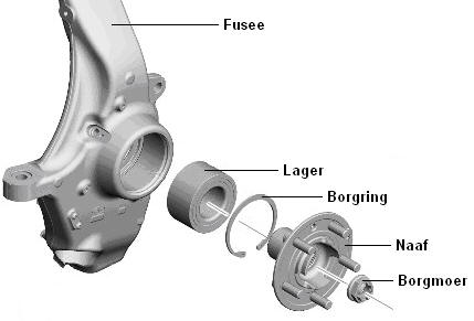 To replace the bearing, the hub must be pressed out from the inside of the bearing. A bearing puller or slide hammer can also be used to remove the hub. The bearing will always be damaged in the process, so it must always be replaced after disassembly. Once the hub is removed from the bearing, the bearing must be pressed out from the steering knuckle. The image below shows an overview of the bearing and hub assembly. The lock nut is screwed onto the axle and ensures the bearing is mounted under preload.