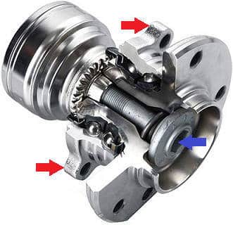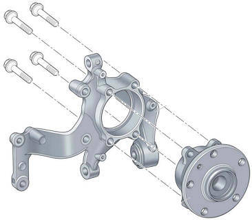 To replace this type of wheel bearing on a driven axle, the drive shaft must be removed (secured with the bolt indicated by the blue arrow in the lower left image), and the bolts of the steering knuckle must be removed (indicated with two red arrows). These are often four bolts.
