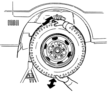 Another defect that can occur in wheel bearings is play. The play can be felt by jacking up the wheel, gripping the tire at the sidewalls, and moving it back and forth (see image).
