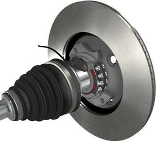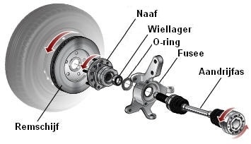 The wheel bearing in the image below is pressed into the steering knuckle. The hub is pressed into the inner ring of the wheel bearing. Thus, the wheel bearing connects the rotating hub with the steering knuckle. The drive shaft provides the power transmission from the transmission to the wheel. The outer splines of the constant velocity joint are inserted into the inner splines of the hub. This transmits the driving forces from the drive shaft to the hub, where the brake disc and wheel are mounted.
