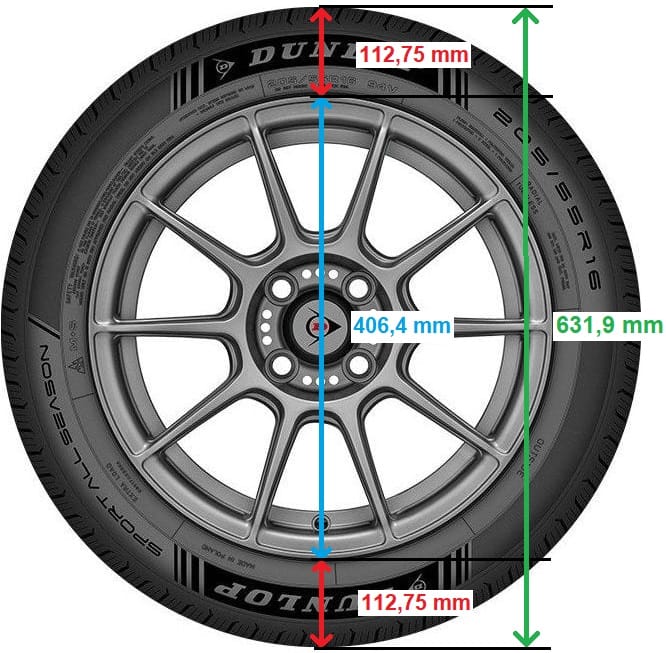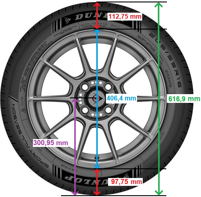 - 55 = tire sidewall height from the road to the underside of the rim = 55% of 205 (0.55 x 205 = 112.75 mm)