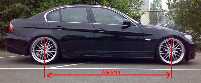 The wheelbase of a car is the distance between the centers of the front and rear axles (see image below). When a car has a long wheelbase, it is therefore more spacious than a car with a short wheelbase. The wheelbase is always specified in millimeters and is always listed in the factory specifications of the car.