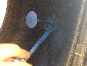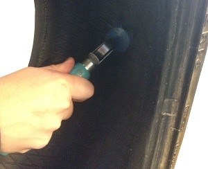 Apply the special blue glue on the surface of the tire and on the underside of the plug. Ensure a layer of glue is present, but do not apply too much! Thick blobs or droplets will not dry.