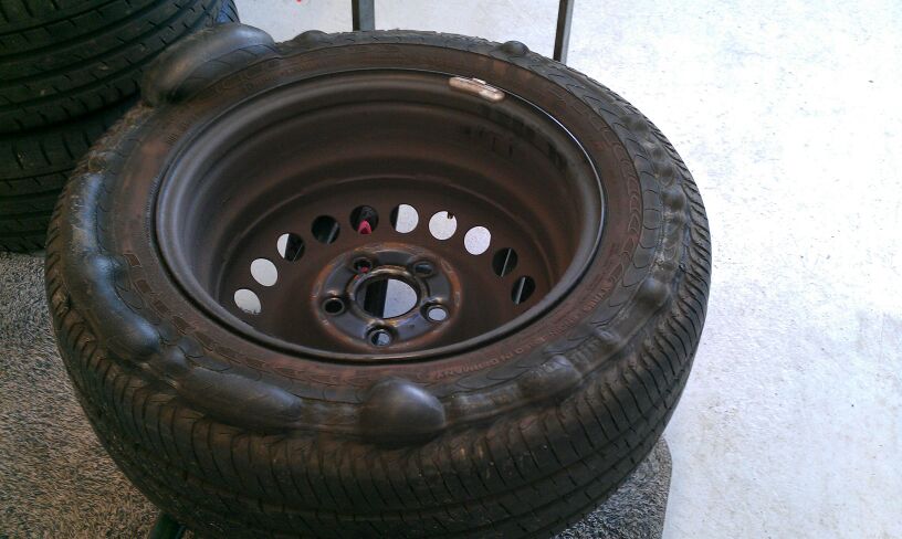 The image shows a tire from a car with too much positive camber. The carcass is visible, while the outside seems fine.