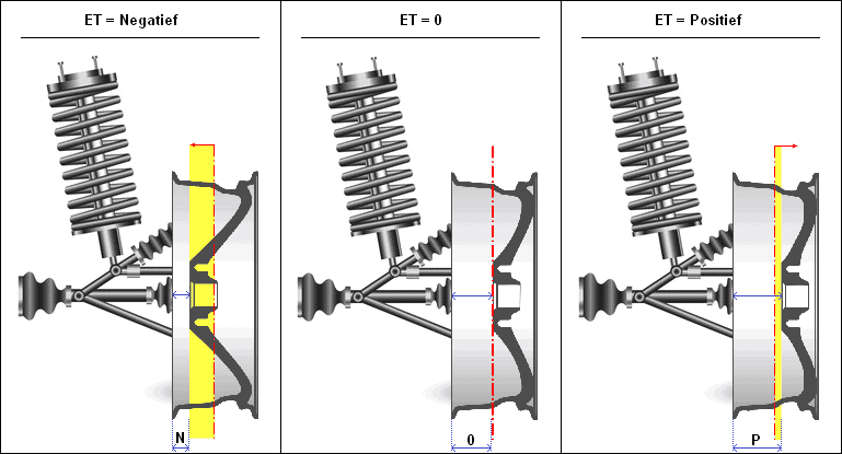 This means the rim is shifted more inward. Consequently, the rim might hit the shock absorber. This not only increases the risk of interference, but also compromises driving characteristics. This issue can be resolved with wheel spacers. These are metal discs mounted on the wheel hub – between the brake disc and the rim. In this case, the difference between the ET 30 and ET 50 is 20mm (2cm). By mounting 2cm spacers, the issue is resolved. A note on wheel spacers: In the aforementioned example, the lack of distance is compensated with spacers. However, it is not recommended to mount them when the offset value is correct. While the wheels will stand further outward, the scrub radius (and thus the driving characteristics) changes outside of factory tolerances. Even if this looks visually appealing and sporty, there are definite downsides.