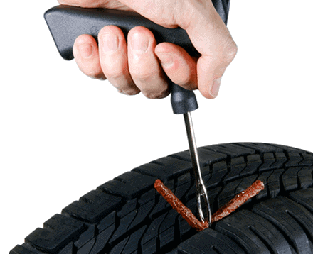 The tire can be repaired both from the inside and the outside in a garage. External repairs do not require dismantling the tire and involve inserting a plug to seal the hole. This method should be seen more as a temporary fix and not a permanent repair. The plug may be ejected from the tire at high vehicle speeds. Additionally, this emergency repair does not allow inspection of the tire’s interior; if driven too long on a tire with low pressure, there could be visible damage to the inside of the sidewalls. Over time, this could lead to a blowout.
