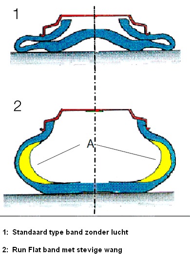 It can, however, be noticeable while driving as the car may exhibit different handling characteristics. Many people mistakenly believe that if a Run-Flat tire is flat, it can always be driven on until it is repaired. This is incorrect. A flat Run-Flat tire must always be kept at a pressure above 14 psi. If driven with pressure below 14 psi, the sidewall gets damaged and the tire must be replaced. If the tire is kept above 14 psi with a compressor from the trunk, it can usually still be repaired afterwards. Disadvantages of Run-Flat tires are primarily the price (often much higher than a regular tire) and the comfort. Due to the sidewall stiffness, the tire is also much stiffer and thus less comfortable. Run-Flat tires cannot be mounted on standard rims. The shape of the rim is unsuitable for this. Conversely, standard tires can be mounted on Run-Flat-compatible rims, but the risk is that often no tire pressure monitoring system is present in the car and a flat tire is not detected quickly enough.