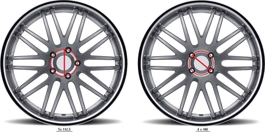 The number 112 is the diameter in millimeters where the wheel bolt holes are located. This is also known as the bolt pattern. Every car has a specific bolt pattern, noted in the factory specifications or on the rims mounted on the car. For a pattern of 5 x 112.5, an imaginary circle must be drawn through the center of the bolt holes. An example of this can be seen in the two images below. The diameter of the circle is the bolt pattern. With a pattern of 4 x 100, it can be measured from the center of one bolt hole to the center of another.
