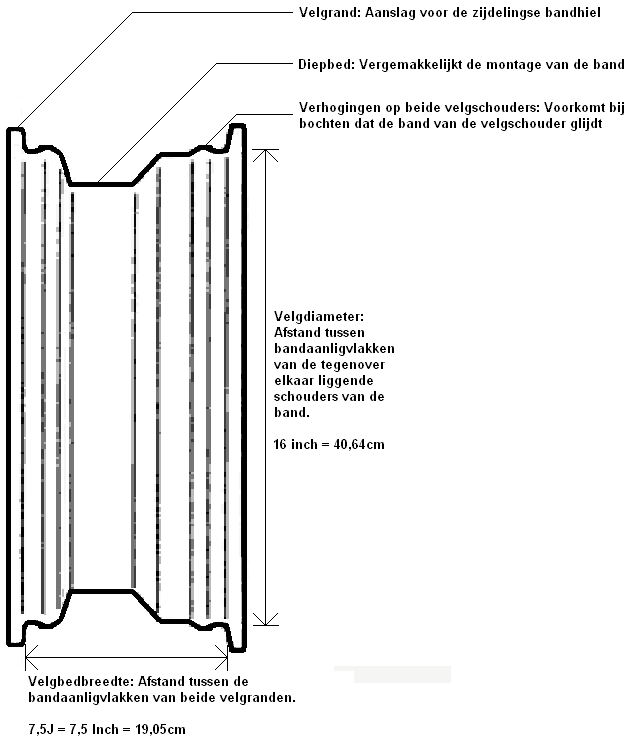 The image shows a drawing of a rim. The bead of the tire, once mounted, sits between the rim lip and the humps of both rim shoulders. The raised areas prevent the tire from slipping off the rim position. If this were to happen, air would spontaneously escape, causing the rim to hit the road. This could also occur with a blowout or when driving with a flat tire.