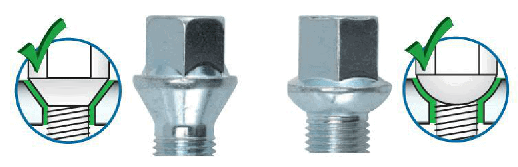 Wheel bolts come in two types, aside from diameter and length: conical and ball seat. When mounting different wheels, attention must be paid to possible differences in the head that clamps into the rim. The image shows the difference between wheel bolts; conical on the left and ball seat on the right. If accidentally switched, there’s a high chance the bolts will come loose while driving.