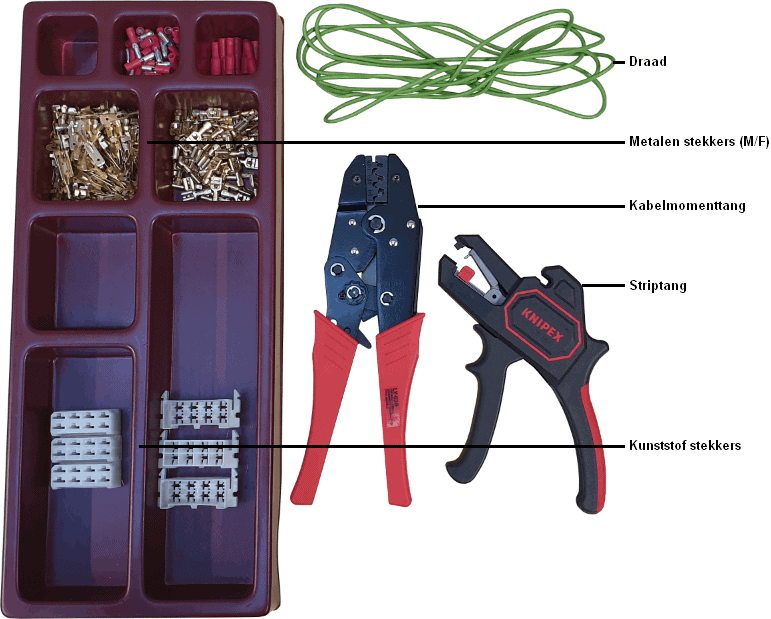 - Left: a crimping pliers with two metal connectors (male and female);