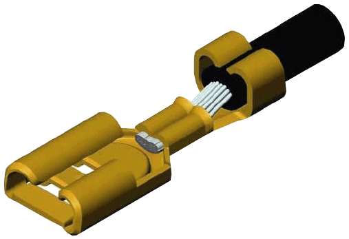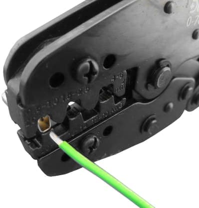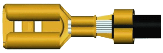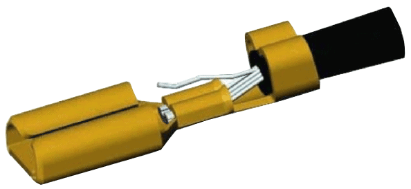 After the wire is stripped (the copper wire is 2 mm long), cable terminals (insulated/uninsulated) or metal connectors can be crimped onto it. In the following three images, the following is visible: