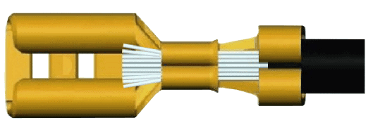 The insulation is stripped too short and is crimped into the inner part of the cable terminal. Because this part is thicker than the copper wire, the cable terminal is not completely crimped closed. The possible consequence of this is poor contact between the copper wire and the cable terminal.