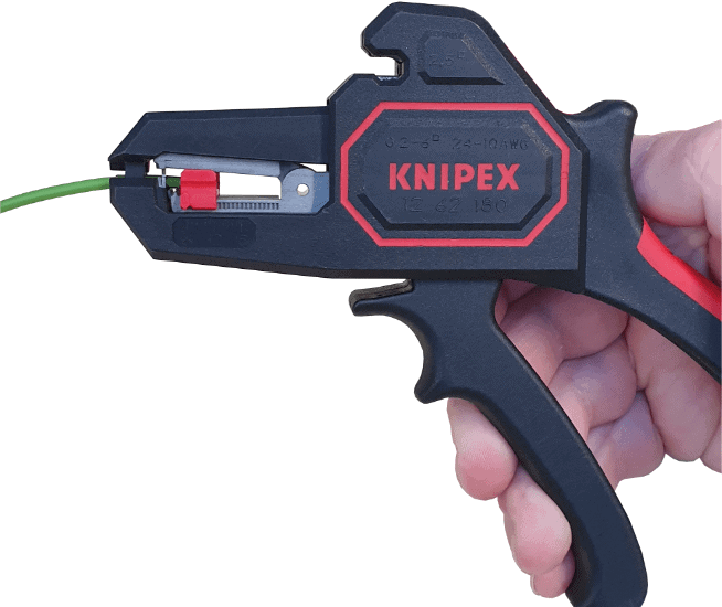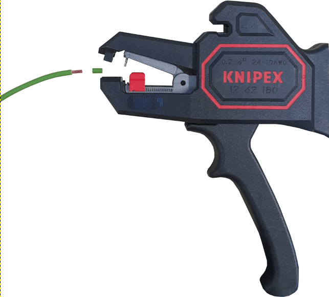 - left: first, determine the length you want to strip the wire by setting the red part to another position. Far left, as in the image, the length is 2 mm. Squeeze the pliers. The jaws close and the metal mechanism grips the insulation. Squeeze the pliers completely. The insulation is slid off the wire at the adjusted distance;