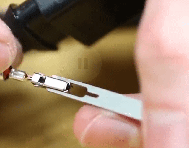 - Middle: the metal connector is clicked into the crimping pliers, and the stripped wire is inserted into the back of the metal connector;
