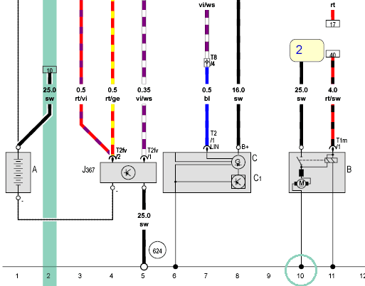 In cars, we find many different wire thicknesses. In the engine compartment, we find thin wires from sensors and relatively thick wires to actuators. In the following schematic, we see a black (ground) wire on the battery (A) of 25.0 mm8 this is the thickest wire we find in the engine compartment. On the alternator (C) we see a black wire on the B+ of 16.0 mm8 on the control unit J367 we find significantly thinner wires ranging from 0.35 to 0.5 mm8.