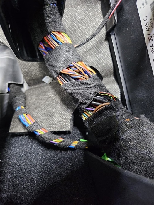 In the following image, we see a part of the wiring harness where dozens of wires run through. The wiring harness is wrapped with tape to keep the wiring together. The colors are still visible between the windings of the tape, allowing a mechanic to easily trace the wire color when troubleshooting.