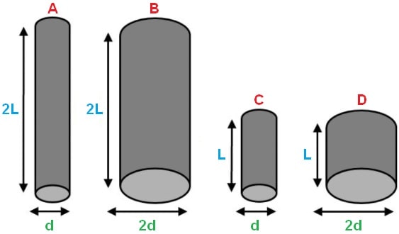 The following image shows four wires of the same material, with wire A having the highest and wire D having the lowest resistance.