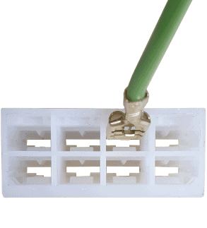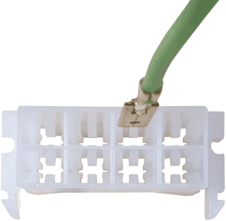 During a wire repair, it is possible that a new plug needs to be crimped onto the wire. This is done with a crimping pliers, also known as a crimping tool. In this example, uninsulated metal plugs are crimped onto the wire and clicked into plastic connector blocks.